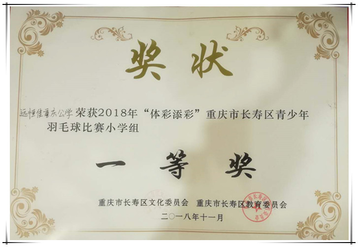 3、2018年11月9日-12日,長壽區(qū)羽毛球比賽小學(xué)組、高中組榮獲一等獎(jiǎng)、二等獎(jiǎng)