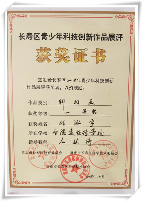 8、2018年12月,長壽區(qū)青少年科技創(chuàng)新作品展評(píng)獲得一等獎(jiǎng)、二等獎(jiǎng)