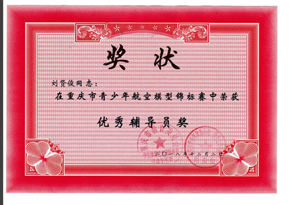 獲得重慶市青少年模型錦標(biāo)賽優(yōu)秀輔導(dǎo)員稱號(hào)