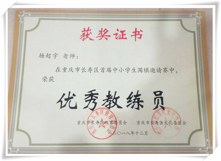2、2018年11月,楊超宇老師獲得長壽區(qū)羽毛球比賽、圍棋比賽優(yōu)秀教練員稱號(hào)