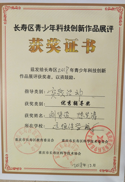 5、2018年12月,劉賢俊、左絲綺、陳先濤老師獲得長壽區(qū)青少年科技創(chuàng)新作品展評(píng)一等獎(jiǎng)、優(yōu)秀輔導(dǎo)獎(jiǎng)