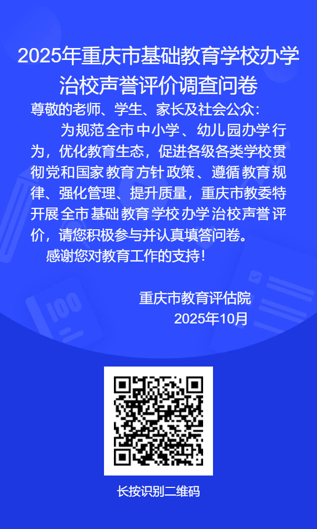 當(dāng)前位置:美好學(xué)校>校務(wù)公開(kāi)> 轉(zhuǎn)發(fā):重慶市長(zhǎng)壽區(qū)教師發(fā)展中心 關(guān)于開(kāi)展2025年基礎(chǔ)教育學(xué)校辦學(xué)治校 聲譽(yù)評(píng)價(jià)問(wèn)卷調(diào)查工作的通知