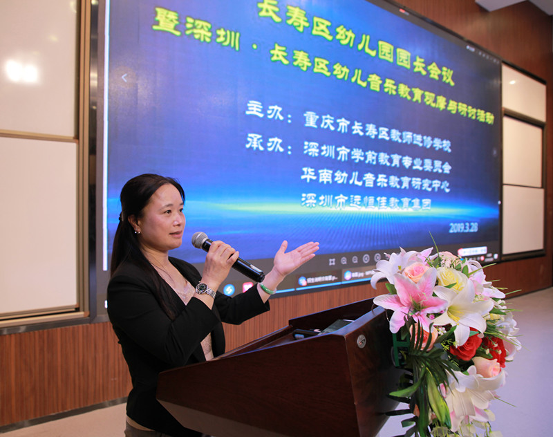 參加本次活動(dòng)的有:長(zhǎng)壽區(qū)教委副主任趙明,長(zhǎng)壽區(qū)教師進(jìn)修學(xué)校校長(zhǎng)余信華,長(zhǎng)壽區(qū)教育委員會(huì)成職教科科長(zhǎng)張蕓葫,長(zhǎng)壽區(qū)示范幼兒園書記、園長(zhǎng)高俊英,長(zhǎng)壽區(qū)示范幼兒園視導(dǎo)員李萍,深圳市學(xué)前教育專業(yè)委員會(huì)秘書長(zhǎng)郭瓊女,深圳市名師、中國(guó)早期兒童音樂(lè)舞蹈教育發(fā)展和研究中心——華南研究中心負(fù)責(zé)人、深圳市音樂(lè)教育學(xué)科帶頭人陳碧琴老師和她工作室的老師們,深圳市遠(yuǎn)恒佳教育集團(tuán)副總裁麥麗芬女士,深圳市遠(yuǎn)恒佳教育集團(tuán)董事長(zhǎng)助理、副總裁程琳娜,深圳市資深優(yōu)秀園長(zhǎng)、遠(yuǎn)恒佳教育集團(tuán)幼教中心教學(xué)總監(jiān)唐玉萍,遠(yuǎn)恒佳教育集團(tuán)學(xué)前管理中心重慶分部主任彭家敏。教研會(huì)由長(zhǎng)壽區(qū)教師進(jìn)修學(xué)校幼教教研員鄧勇主任主持。