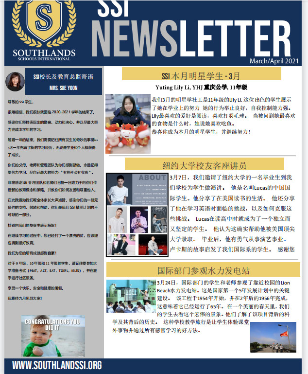 2021年4月21日六我校留學部中方校長獲悉:美國索斯蘭新聞轉(zhuǎn)載了重慶市遠恒佳學校留學部的新聞并將其翻譯成中文同時發(fā)布。與此同時,重慶市遠恒佳學校留學部李玉婷同學被評為美國索斯蘭月明星學生。在此表示祝賀!