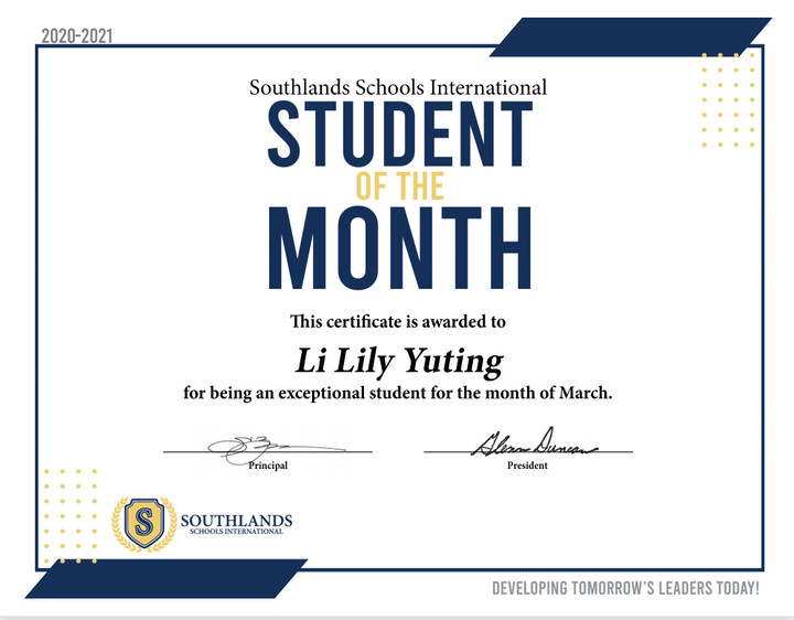 祝賀重慶市遠恒佳學校留學部李玉婷同學被評為美國索斯蘭月明星學生
