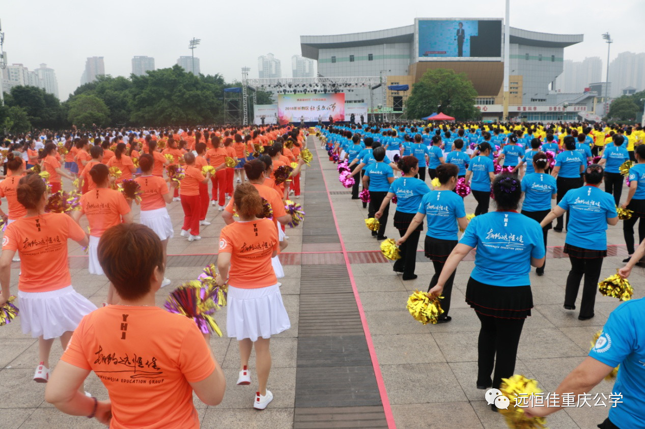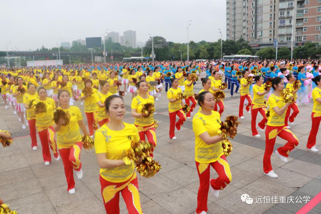19個街鎮(zhèn)1000人的比賽隊伍,身穿遠(yuǎn)恒佳重慶公學(xué)的文化衫,在體育廣場歡歌暢舞。
