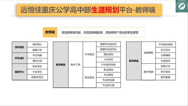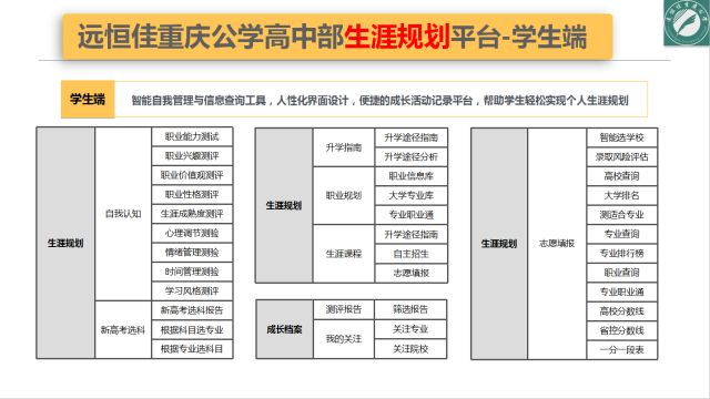 從高一到高三為每個(gè)孩子制定詳細(xì)的生涯喚醒、生涯探索、生涯決策等方案,根據(jù)大數(shù)據(jù)量身定制個(gè)性化生涯規(guī)劃。