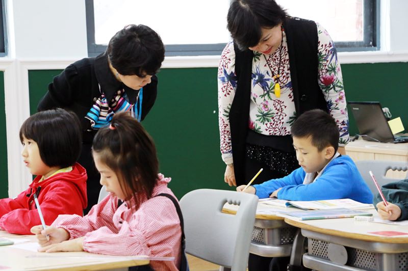 金慶花博士與老師一起觀察學(xué)生學(xué)習(xí)狀況