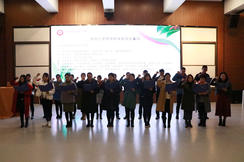 全體班級教學(xué)委員會主任到臺前莊嚴(yán)宣誓,他們緊握右拳,表達了對教育事業(yè)的摯愛,將高舉美好教育的旗幟,做有愿景、重文化、懂浪漫的教師。