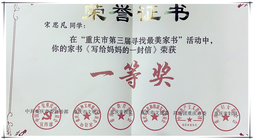 小學(xué)部四(1)班宋思凡同學(xué),在中共重慶市委宣傳部、重慶市文明辦、重慶市教委、重慶市文化旅游委、共青團(tuán)重慶市委、重慶市婦聯(lián)主辦的重慶市第三屆尋找最美家書活動(dòng)中,榮獲重慶市一等獎(jiǎng)。