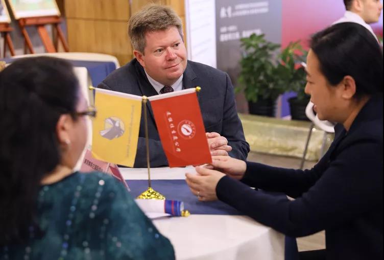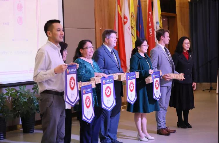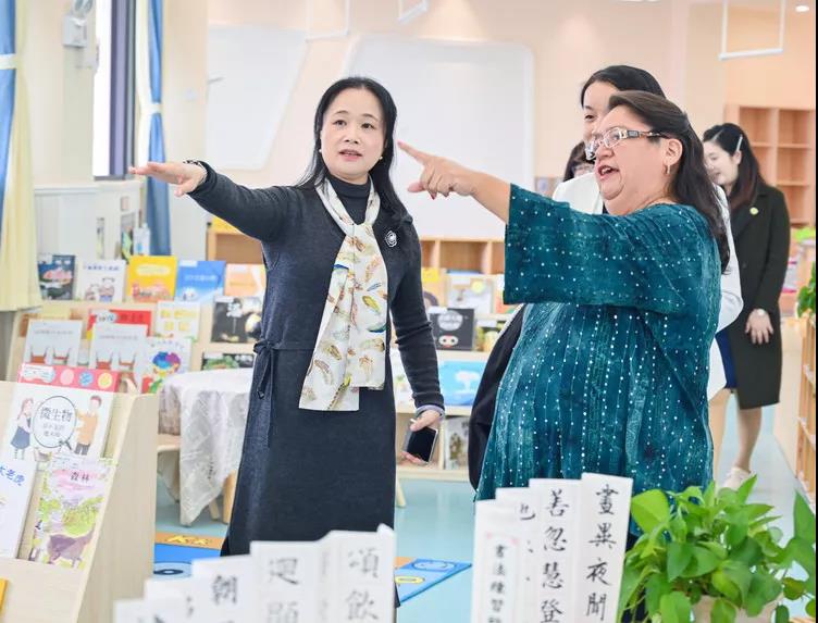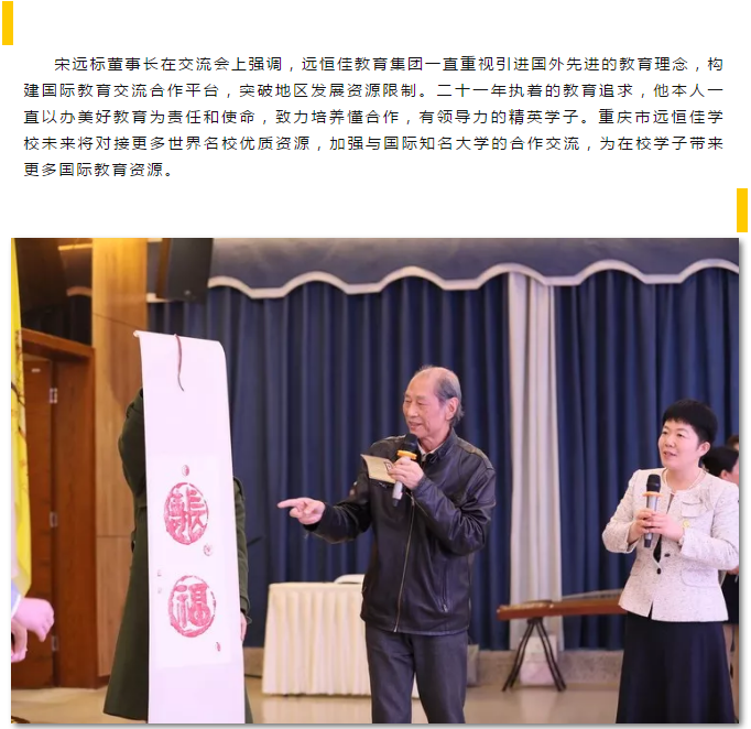 楊秀珍總校長為來訪國際名校校方代表贈送禮物Ms. Yang Xiuzhen, the headmaster of Yuanhengjia Chongqing Collegewas presenting our guests with gifts