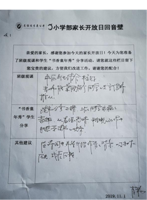 家長們在意見反饋表中都很認同閱讀分享這樣人人上臺鍛煉的形式,希望孩子們以閱讀豐盈自己的內(nèi)心,增加生命的寬度和厚度。