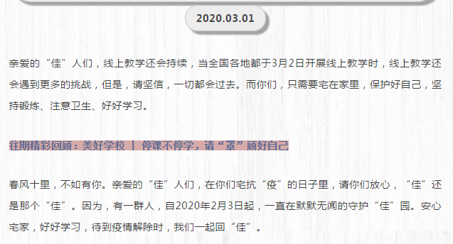 上一頁(yè):美好學(xué)校|您抗“疫”,我接力 下一頁(yè):美好課程 | 一場(chǎng)疫情掀起的線上學(xué)習(xí)新模式
